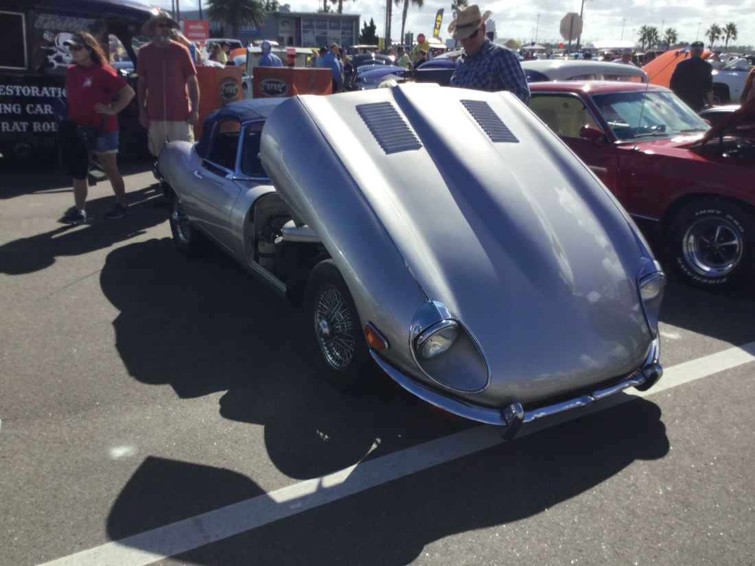 Today’s car of the day is this ’70 Jaguar E-Type that was at the 2018 Daytona Turkey Rod Run. The Jaguar E-Type is a sports car that was made between 1961 and 1975. This is from the Series 2, which was made between 1968 and 1971. The engine is a 4.2 liter straight-6 that produces 207 horsepower and 283 pound-feet of torque. The transmission is a 4-speed manual. This car does 0-60 mph in 7.2 seconds and has a top speed of 149 mph.
