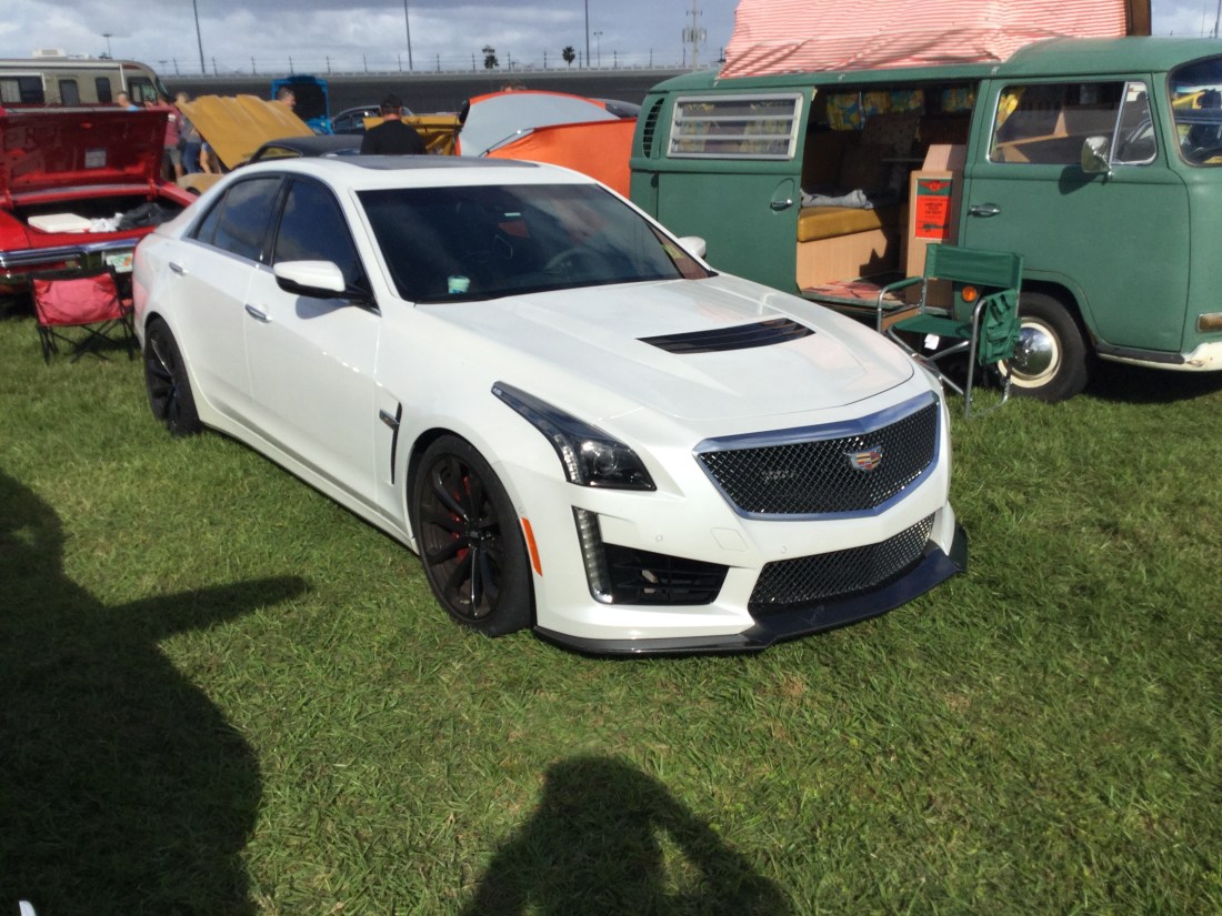 This is a 2017 Cadillac CTS-V that was at the 2018 Daytona Turkey Rod Run. The CTS-V is the high performance version of the CTS, and was introduced in 2004. This is from the third generation of the CTS-V, which was introduced at the 2015 North Americam International Auto Show. The engine is the LT4, which is a 6.2 liter supercharged V8 that produces 640 horsepower and 630 pound-feet of torque. The transmission is an 8-speed automatic. This car does 0-60 mph in 3.6 seconds and has a top speed of 200 mph. This car weighs 4,145 pounds since the chassis is unitary steel.