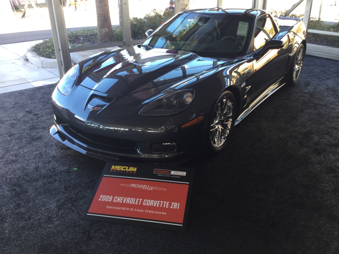 This is a 2009 Corvette ZR1 that was at the 2019 Mecum Auction in Kissimmee. It’s from the C6 series, which was made between June of 2004 and February of 2013 (model years between 2005 and 2013). The ZR1 was unveiled at the 2008 North American International Auto Show. The engine is the LS9, which is a 6.2 liter supercharged V8 that produces 638 horsepower and 604 pound-feet of torque. The transmission is a 6-speed manual. This car does 0-60 mph in 3.4 seconds and has a top speed of 205 mph. This car weighs 3,380 pounds since the body panels are composite, the chassis is a hydroformed steel frame, and the front fenders, roof, and hood are carbon fiber.