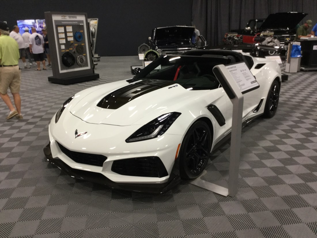This is a 2019 Corvette ZR1 that was at the 2019 Barrett-Jackson Auction in Palm Beach. It’s from the C7 series, which has been in production since 2013 (the first model year was 2014). The ZR1 was unveiled at the 2017 Dubai Motor Show, and the convertible version was unveiled at the 2017 Los Angeles Auto Show. The engine is the LT5, which is a 6.2 liter supercharged V8 that produces 755 horsepower and 715 pound-feet of torque. The transmission of this one is a 7-speed manual. This car weighs 3,583 pounds since the chassis is an aluminum spaceframe. The front splitter and rear spoiler are carbon fiber. This car does 0-60 mph in 2.8 seconds and has a top speed of 211 mph. The starting price of the ZR1 is $121,995.