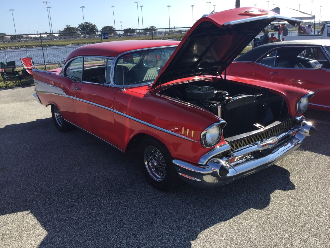 This is a ’57 Chevy Bel Air that was at the 2019 Daytona Turkey Rod Run. The Chevy Bel Air is a full size luxury car that was made between 1949 and 1980 (model years between 1950 and 1981). This is from the second generation, which was made between 1954 and 1957 (model years between 1955 and 1957). The engine of this one is a 4.3 liter Small Block V8 that produces 162 horsepower and 257 pound-feet of torque. The transmission of this one is a 3-speed manual. This car does 0-60 mph in 10.8 seconds and has a top speed of 101 mph.