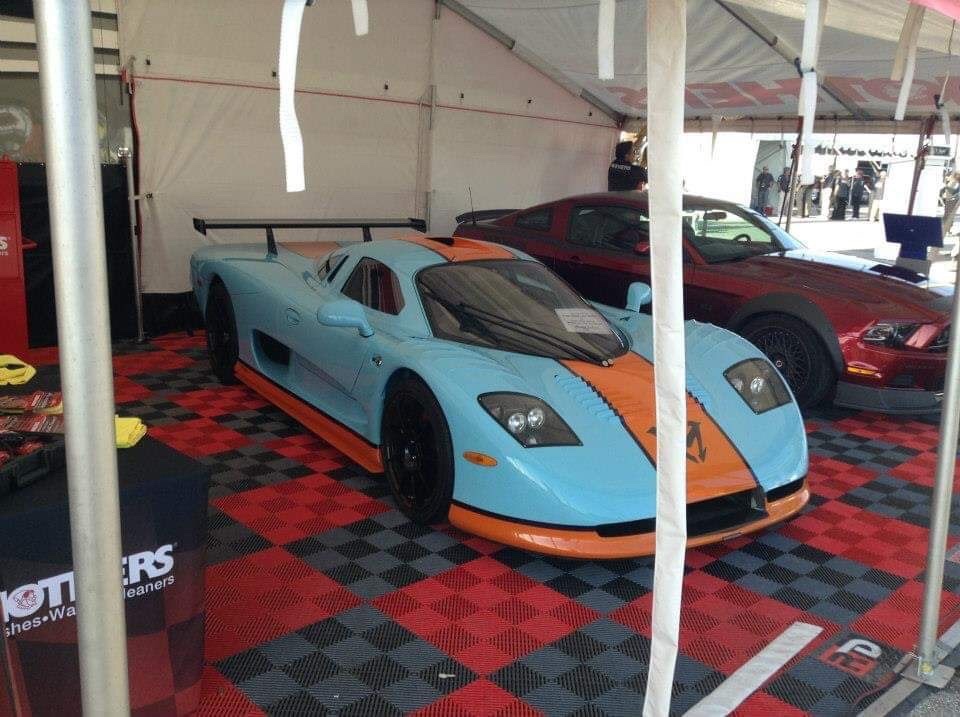 This is a 2008 Mosler MT900S that was at the 2013 Barrett-Jackson Auction in Palm Beach. The Mosler MT900S is a supercar that was made between 2003 and 2010, and only 20 were built. The engine is a 7 liter LS7 V8 that produces 505 horsepower and 470 pound-feet of torque. The transmission is a 6-speed manual. This car can do 0-60 mph in 3.1 seconds and has a top speed of about 200 mph.