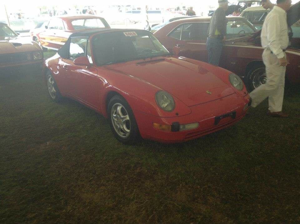 That’s a ’95 Porsche 911 Carrera Cabriolet that was at the 2013 Barrett-Jackson Auction in Palm Beach. The Porsche 911 is a high performance car that has been in production since 1963. This is from the 993 series, which was made between 1994 and 1998 (model years between 1995 and 1998). The engine is a 3.6 liter M64 SOHC flat-6 that produces 272 horsepower and 243 pound-feet of torque. The transmission of this one is a 4-speed automatic. This car does 0-60 mph in 5.2 seconds and has a top speed of 168 mph. This Porsche sold for $28,600.