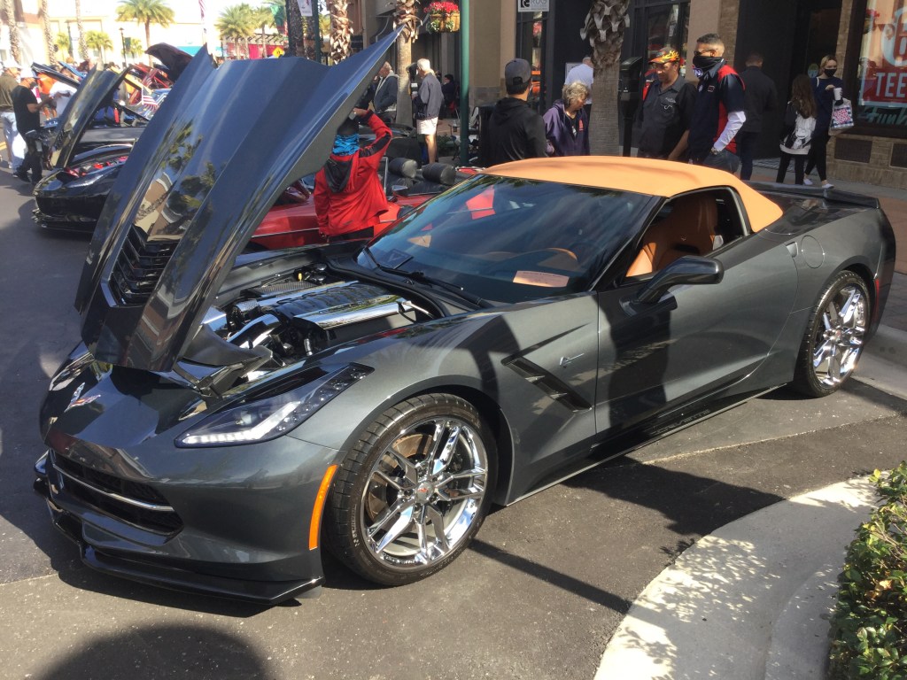 This is a 2016 Corvette Stingray that was at the 2021 Shops at Wiregrass Car & Truck Show. The Corvette is a high performance car that’s been in production since 1953. This is from the C7 series, which was made between 2013 and 2019 (model years between 2014 and 2019). The engine is a 6.2 liter LT1 V8 that produces 455 horsepower and 455 pound-feet of torque. The transmission of this one is an 8-speed automatic. This car does 0-60 mph in 3.8 seconds and has a top speed of 195 mph.