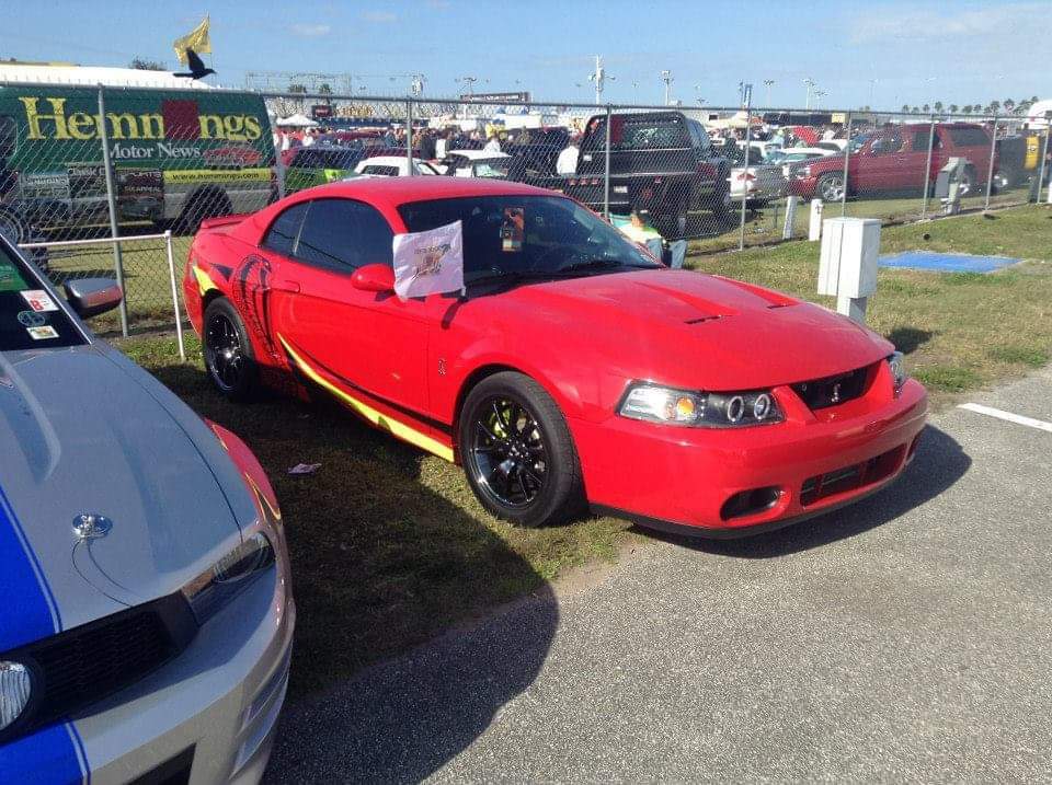 This is a 2003 Mustang Cobra that was at the 2013 Daytona Turkey Rod. The Mustang is a sports car that’s been in production since March of 1964. This is from the second phase of the fourth generation, which was made between November of 1998 and 2004 (model years between 1999 and 2004). This version of the Mustang Cobra was codenamed The Terminator, and was made between 2003 and 2004. The engine is a 4.6 liter supercharged Modular V8 that produces 390 horsepower and 390 pound-feet of torque. The transmission is a 6-speed manual. This car does 0-60 mph in 4.5 seconds and the top speed is limited to 153 mph.