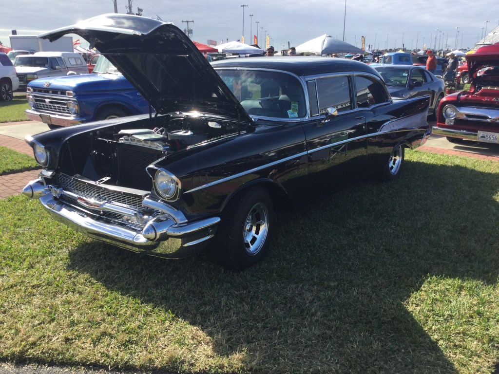 This is a ’57 Chevy Bel Air that was at the 2021 Daytona Turkey Rod Run. The Chevy Bel Air is a full size luxury car that was made between 1949 and 1980 (model years between 1950 and 1981). This is from the second generation, which was made between 1954 and 1957 (model years between 1955 and 1957). The engine of this one is a 3.9 liter Blue Flame straight-6 that produces 140 horsepower and 210 pound-feet of torque. The transmission of this one is a 2-speed Powerglide automatic. This car does 0-60 mph in 15.7 seconds and has a top speed of 94 mph.