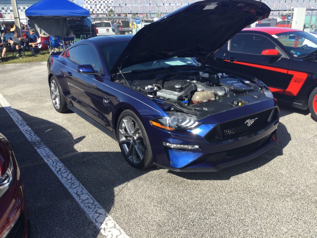 This is a 2019 Mustang GT that was at the 2021 Daytona Turkey Rod Run. The Mustang is a sports car that’s been in production since March of 1964. This is from the second phase of the sixth generation, which has been in production since 2017 (the first model year was 2018). The engine is a 5 liter Coyote V8 that produces 460 horsepower and 420 pound-feet of torque. The transmission of this one is a 10-speed automatic.