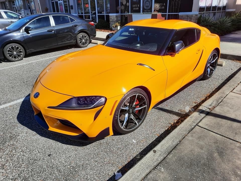 This is a 2024 Toyota Supra GR. The Toyota Supra is a sports car that was originally made between April of 1978 and August of 2003. This is from the fifth generation, which has been in production since March of 2019 (the first model year was 2020). This is based on the 2014 Toyota FT-1 Concept. The production model was unveiled at the 2019 North American International Auto Show. This car is made in Graz, Austria. The engine is a 3 liter turbocharged BMW B58B30 straight-6 that produces 335 horsepower and 365 pound-feet of torque. The transmission is an 8-speed automatic. This car does 0-60 mph in 4.1 seconds and has a top speed of 155 mph.