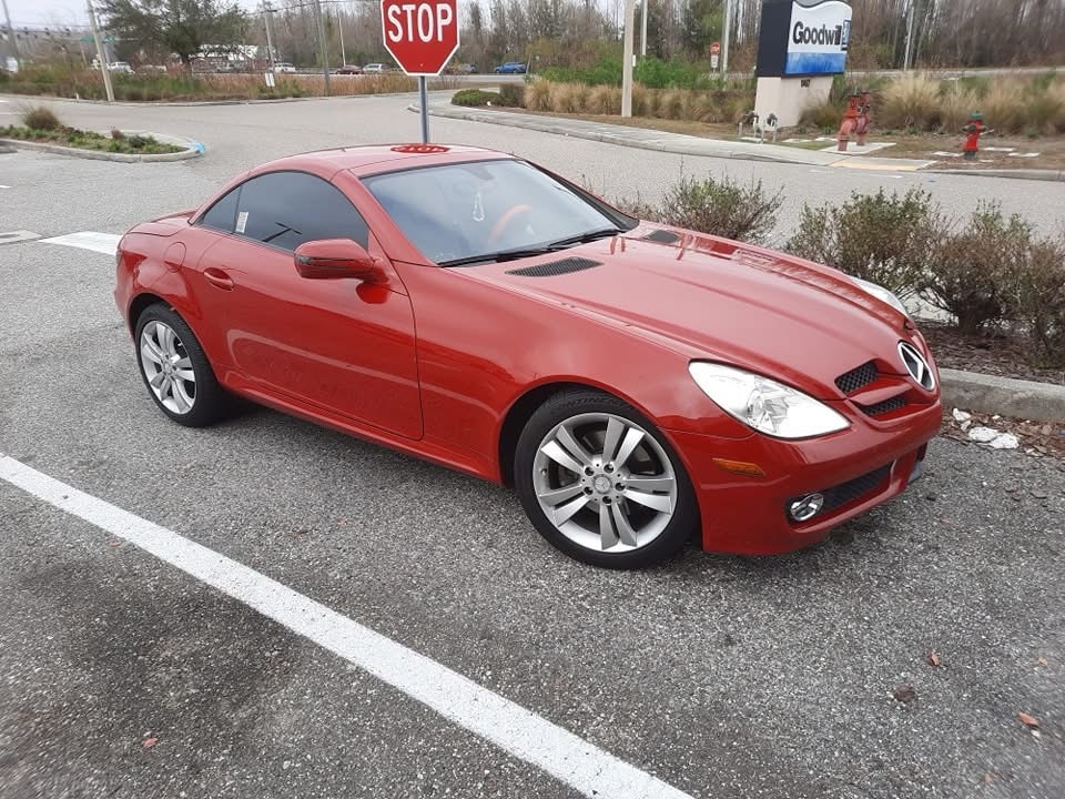 That’s a 2010 Mercedes-Benz SLK300. The SLK-Class is a line of sports cars that was made between 1995 and 2020. This is from the second generation (R171), which was made between 2003 and 2011. The engine is a 3 liter M272 V6 that produces 228 horsepower and 221 pound-feet of torque. The transmission of this one is a 6-speed manual. This car does 0-60 mph in 6.7 seconds and has a top speed of 155 mph.