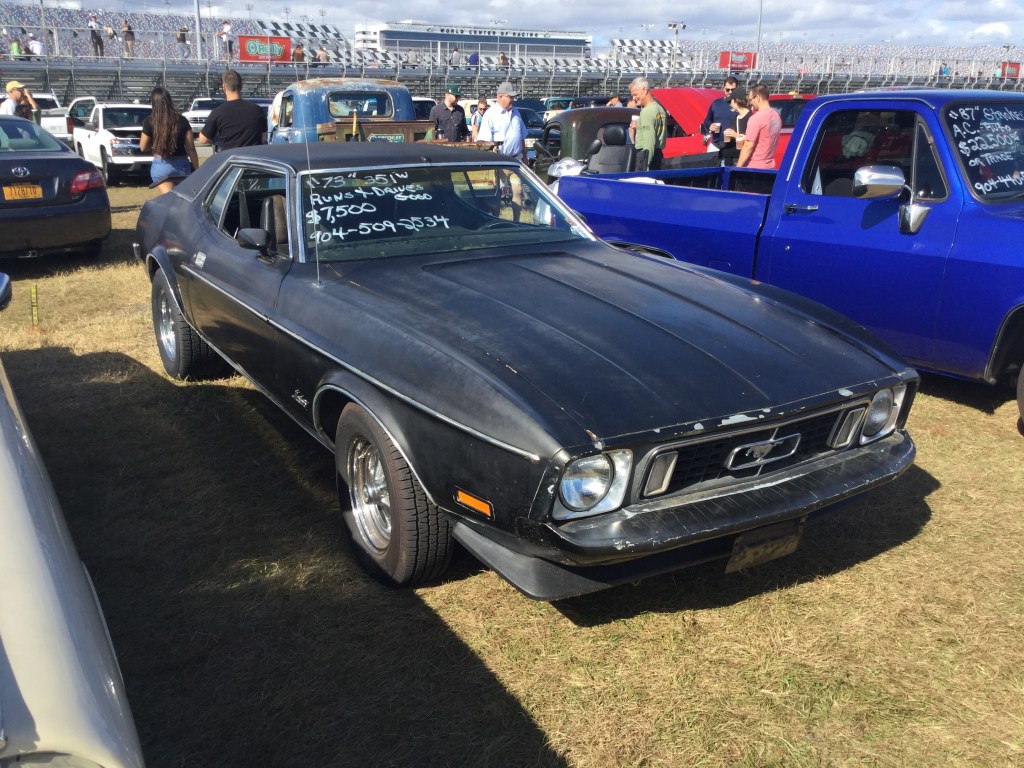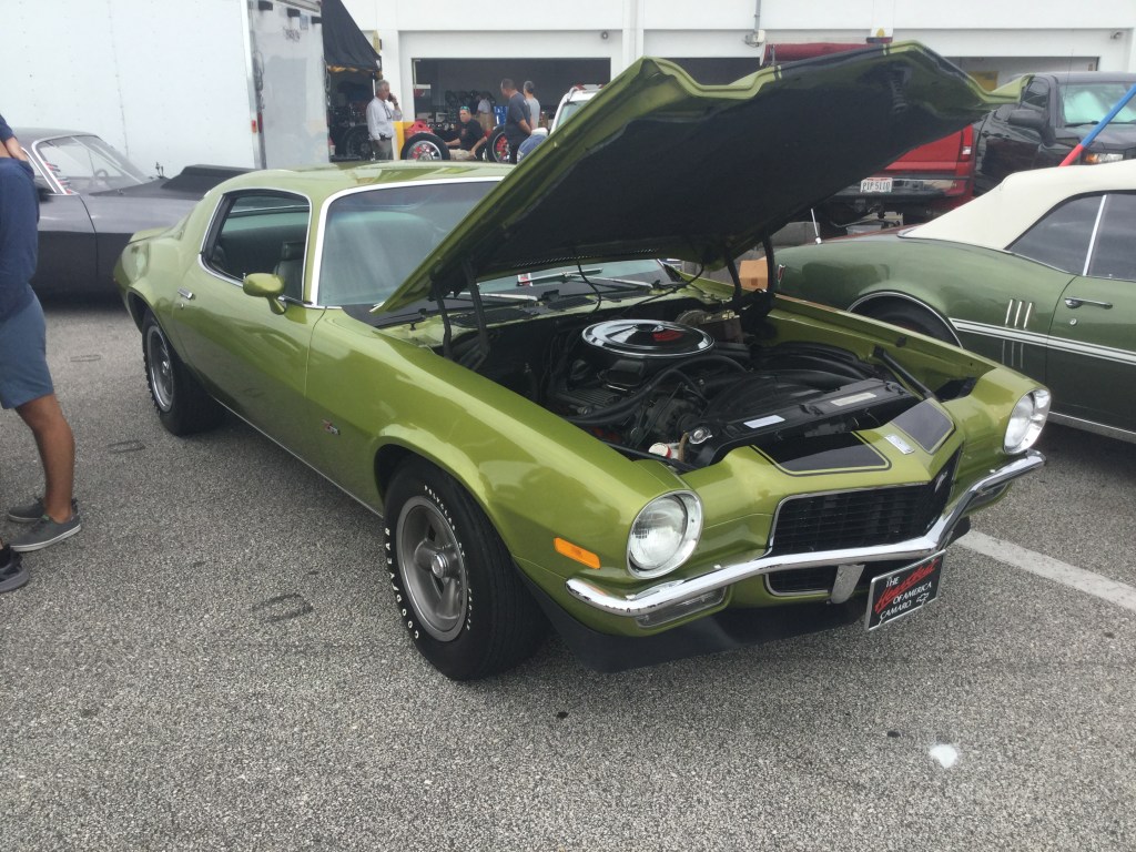 This is a ’73 Dodge Challenger. The original Dodge Challenger is a muscle car that was made between 1969 and 1974 (model years between 1970 and 1974). The engine of this one is a 5.6 liter LA V8 that produces 275 horsepower and 340 pound-feet of torque. The transmission of this one is a 3-speed automatic. This car does 0-60 mph in 6.8 seconds and has a top speed of 130 mph.