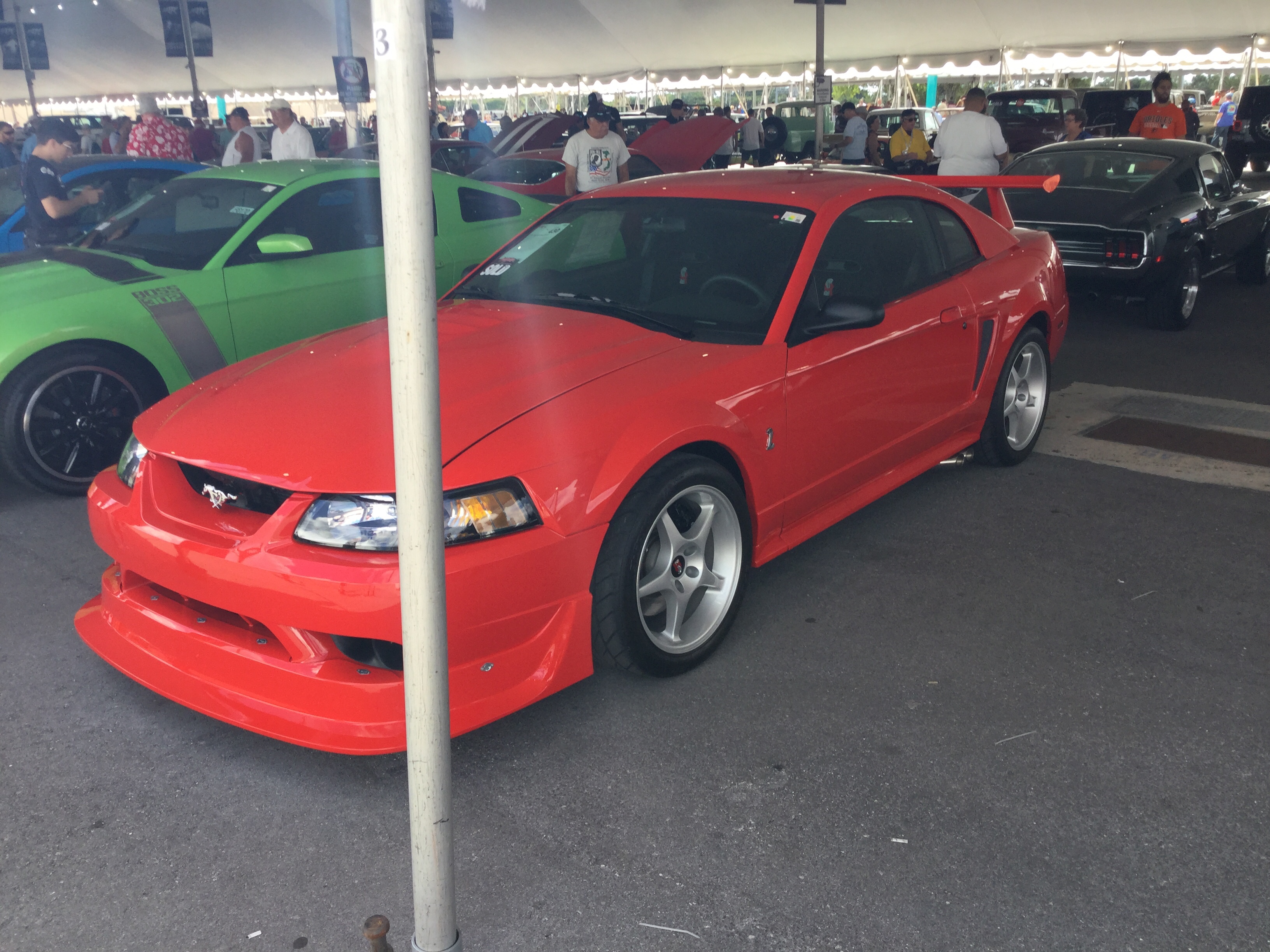 This is a 2000 Mustang Cobra that was at the 2021 Daytona Turkey Rod Run. The Mustang is a sports car that’s been in production since March of 1964. This is from the second phase of the fourth generation, which was made between November of 1998 and 2004 (model years between 1999 and 2004). This version of the Mustang Cobra was made between 1999 and 2001. The engine is a 4.6 liter Modular V8 that produces 320 horsepower and 317 pound-feet of torque. The transmission is a 5-speed manual. This car does 0-60 mph in 5.1 seconds and has a top speed of 153 mph.
