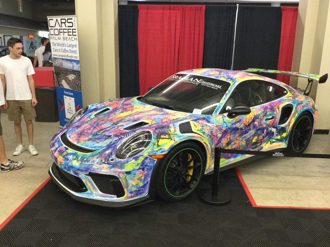 This is a 2019 Porsche 911 GT3RS that was at the 2019 Barrett-Jackson Auction in Palm Beach. The Porsche 911 has been in production since 1963. This is from the second phase of the seventh generation (991.2), which was made between 2016 and 2019. This version of the GT3 was unveiled at the 2018 Geneva Motor Show. The engine is a 4 liter flat-6 that produces 513 horsepower and 347 pound-feet of torque. The transmission is a 7-speed PDK. This car does 0-60 mph in 3.2 seconds and has a top speed of 194 mph. This car weighs 3,153 pounds since the body is made of carbon fiber composite, and the chassis is an aluminum and steel monocoque.