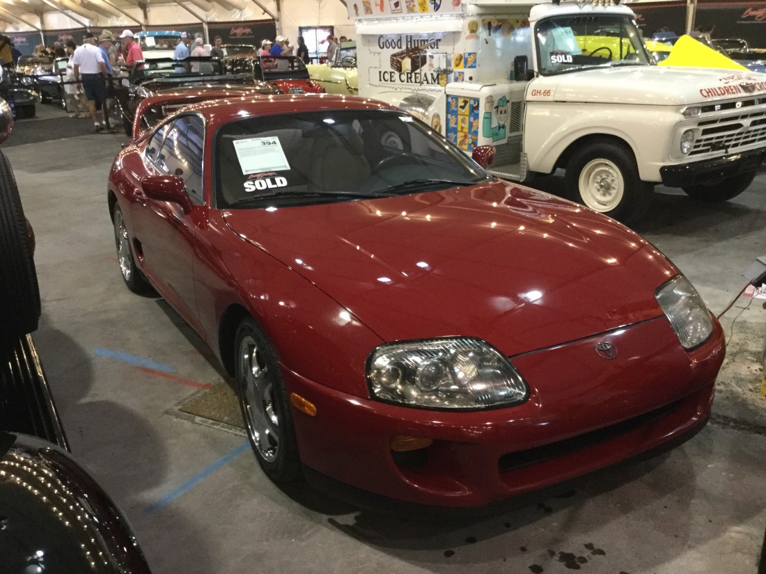 This is a ’93 Toyota Supra that was at the 2019 Barrett-Jackson Auction in Palm Beach. The Toyota Supra is a sports car that was originally made between 1978 and 2002. This is a Mark IV (A80), which was made between April 1993 and August of 2002. The engine is the 2JZ-GTE, which is a 3 liter twin turbo straight-6 that produces 320 horsepower and 315 pound-feet of torque. The transmission is a 6-speed manual. This car does 0-60 mph in 4.6 seconds and has a top speed of 155 mph. This Supra was auctioned off for $34,100.
