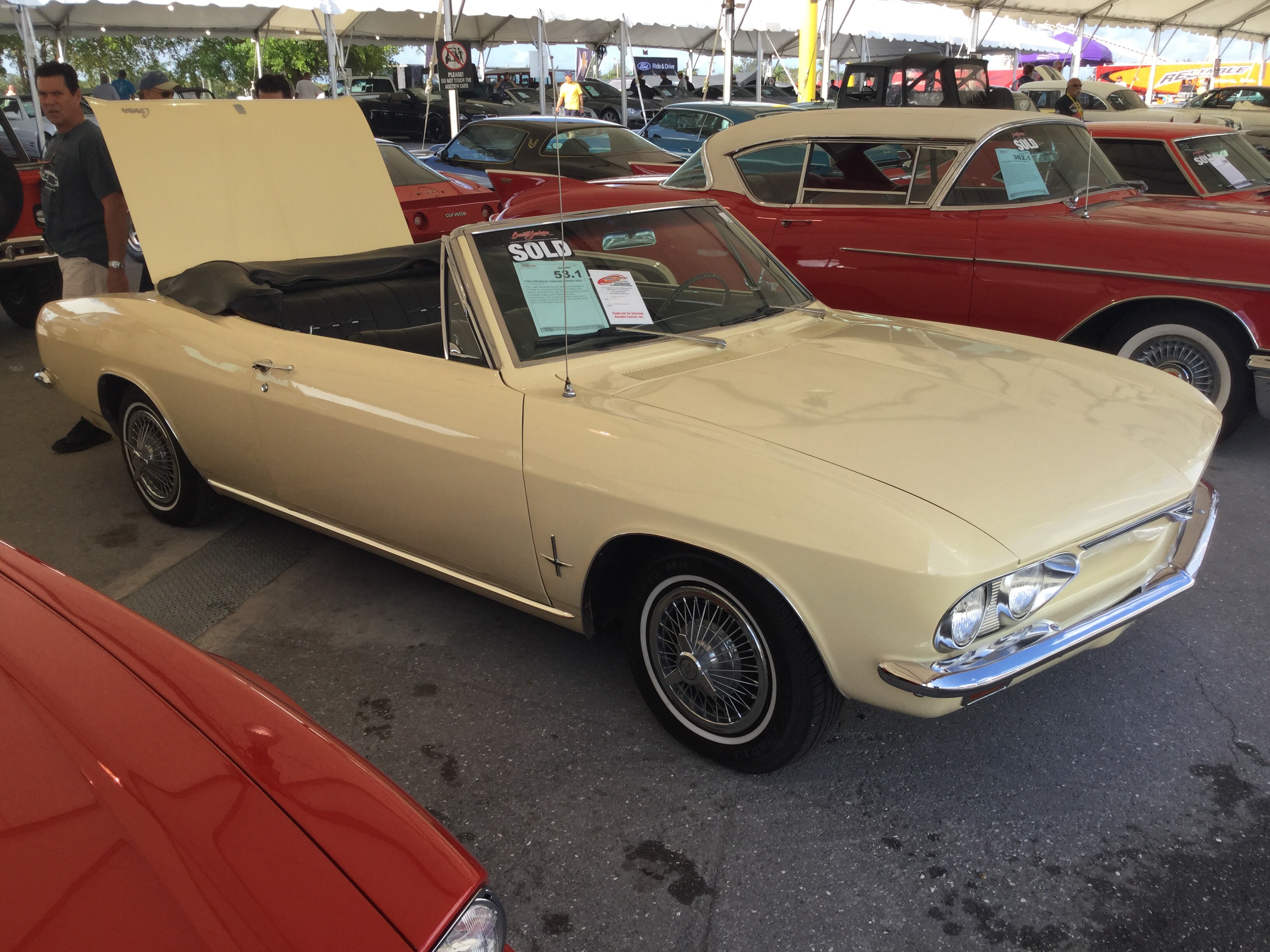 Here’s a ’63 Chevy Corvair. The Corvair is a compact car that was made between 1959 and 1969 (model years between 1960 and 1969). This is from the first generation, which was made between 1959 and 1964 (model years between 1960 and 1964). The engine of this one is a 2.3 liter flat-6 that produces 102 horsepower and 138 pound-feet of torque. The transmission of this one is a 4-speed manual. This car does 0-60 mph in 13.4 seconds and has a top speed of 101 mph.