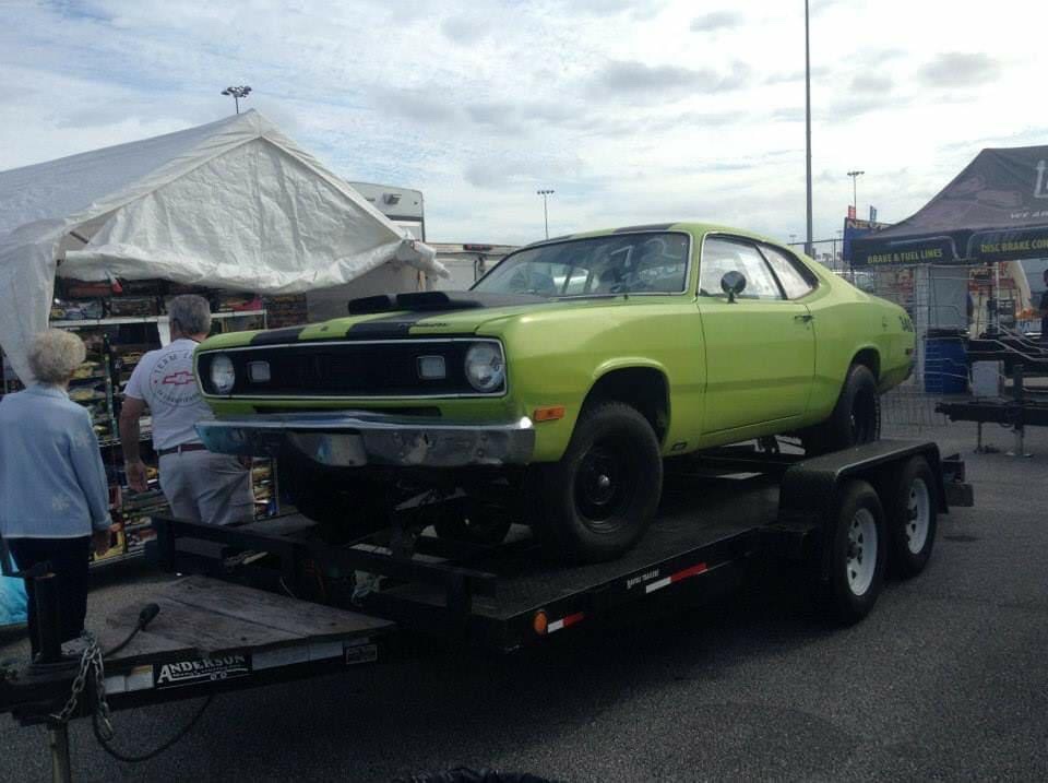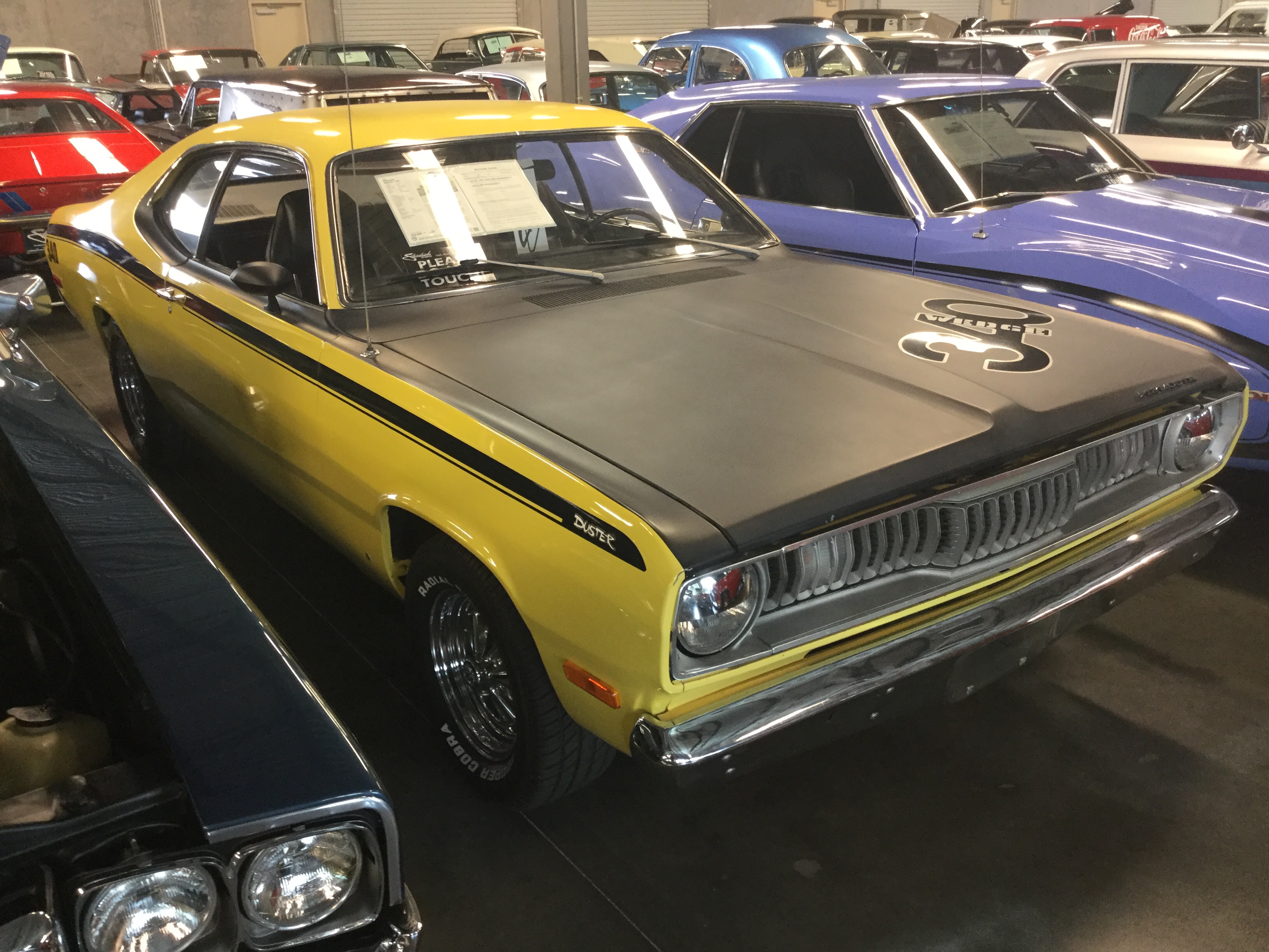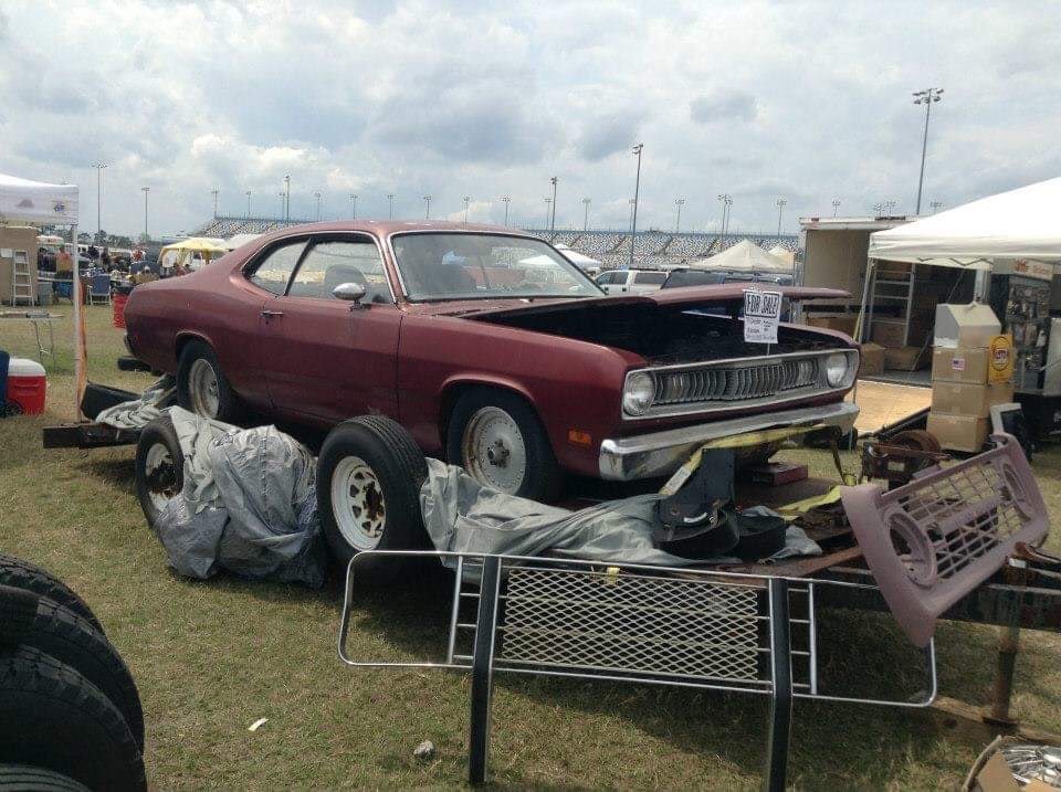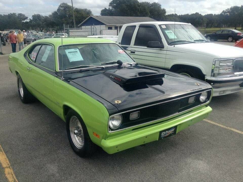 This is a ’72 Plymouth Duster that was at the 2021 Daytona Turkey Rod Run. The Plymouth Duster is a muscle car that was made between 1969 and 1976 (model years between 1970 and 1976). The engine of this one is a 5.6 liter V8 that produces 275 horsepower and 340 pound-feet of torque. The transmission of this one is a 3-speed TorqueFlite automatic.