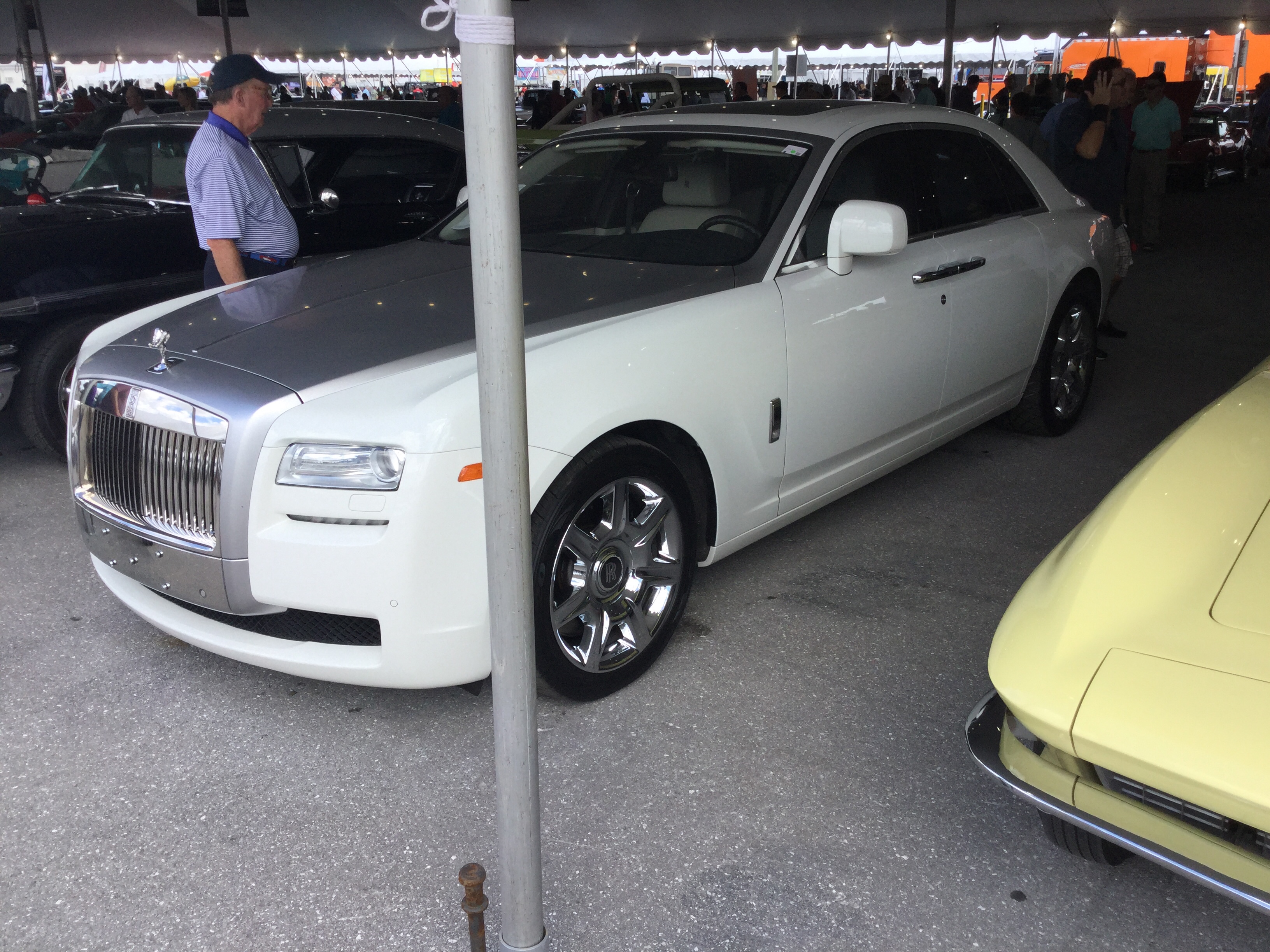 This is a 2012 Rolls-Royce Ghost that was at the 2013 Barrett-Jackson Auction in Palm Beach. The Rolls-Royce Ghost is a luxury sedan that’s been in production since 2009 (the first model year was 2010), and was unveiled at the 2009 Frankfurt Motor Show. The engine is a 6.6 liter twin turbo V12 that produces 563 horsepower and 575 pound-feet of torque. The transmission is an 8-speed automatic. This car does 0-60 mph in 4.7 seconds and has a top speed of 155 mph. This car weighs 5,203 pounds.