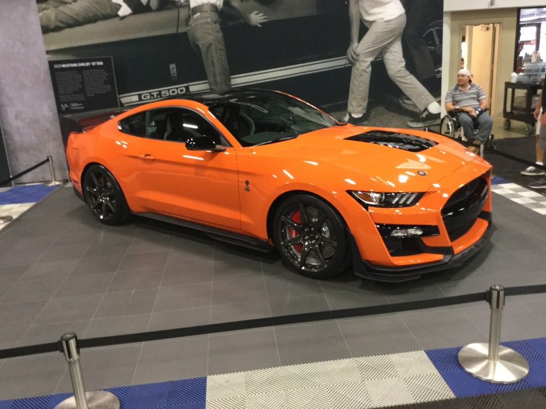 That’s a 2020 Shelby GT500 Prototype that was at the 2019 Barrett-Jackson Auction in Palm Beach. This is from the second phase of the sixth generation of the Mustang, which was introduced on January 17, 2017. This version of the Shelby GT500 was unveiled at the 2019 North American International Auto Show. The engine is a 5.2 liter supercharged V8 that produces 700 horsepower and 600 pound-feet of torque. The transmission is a 7-speed automatic. This car does 0-60 mph in 3.5 seconds and has a top speed of 180 mph.
