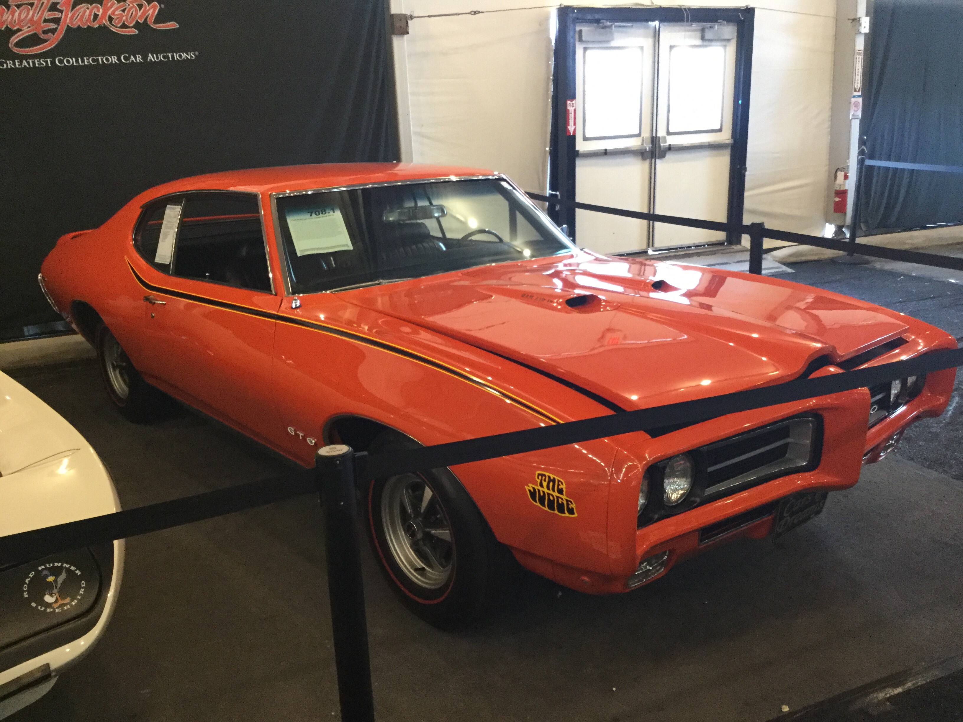 This is a ’66 Pontiac GTO that was at the 2013 Barrett-Jackson Auction in Palm Beach. The Pontiac GTO is a muscle car that was originally made between 1964 and 1974. This is from the first generation, which was made between 1964 and 1967. The engine of this one is a 6.6 liter V8 that produces 360 horsepower and 438 pound-feet of torque. The transmission of this one is a 4-speed manual. This GTO was auctioned off for $43,450.