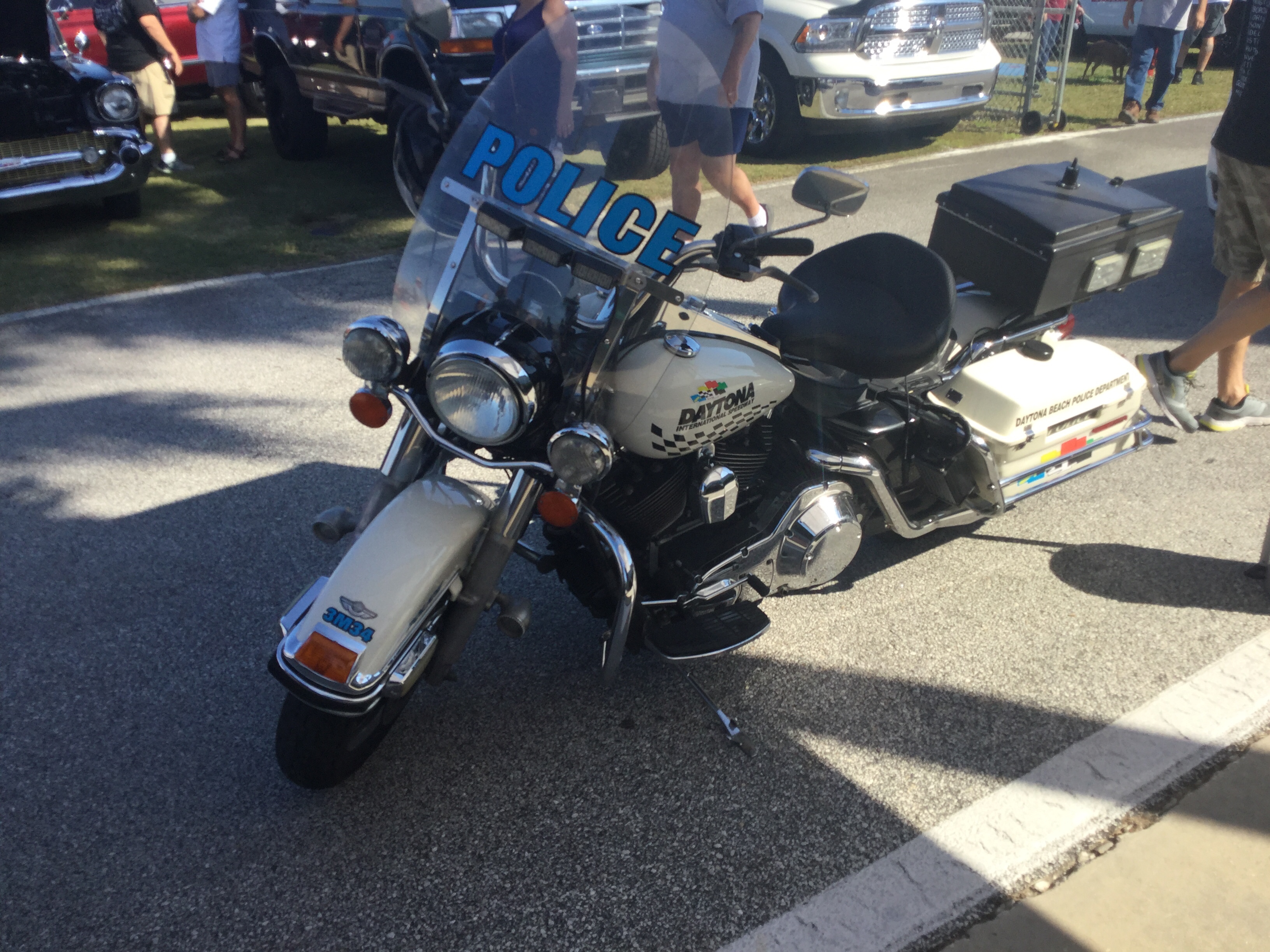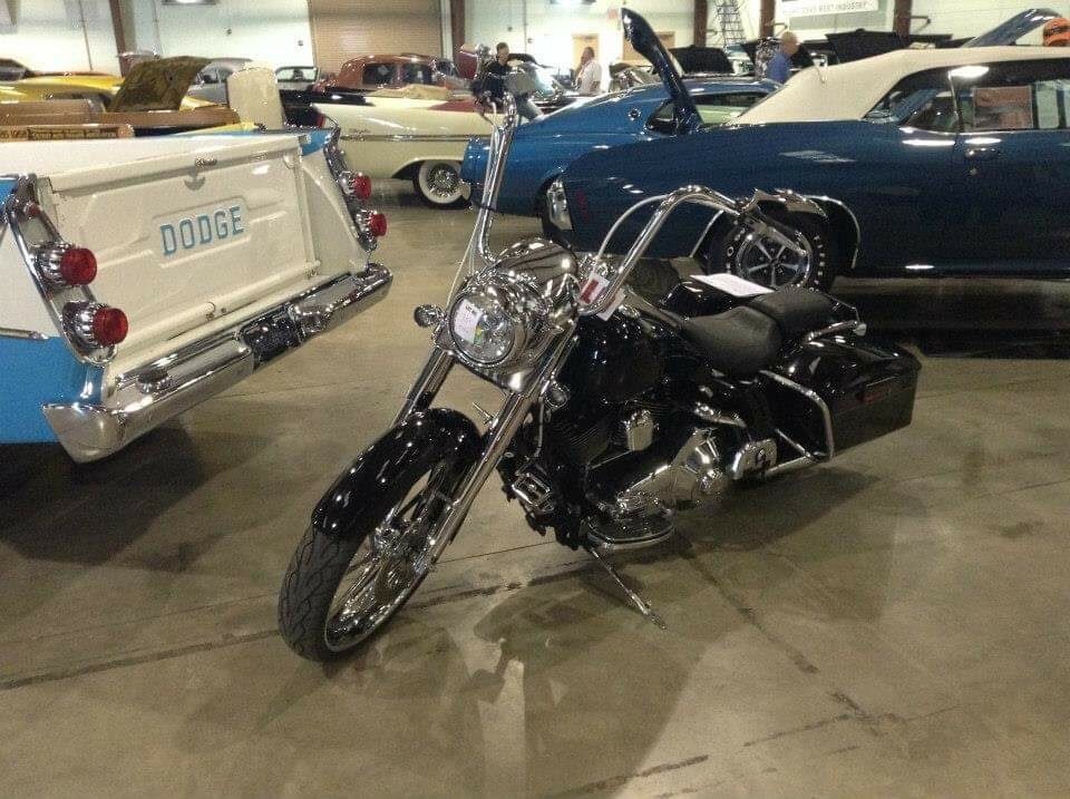 This is a 2001 Harley-Davidson FLHR Road King that was at the 2013 Barrett-Jackson Auction in Palm Beach. The FL is a name designation that Harley-Davidson has been using on motorcycles since 1941. The engine is a 1.6 liter V-twin that produces 92 pound-feet of torque. The transmission is a 6-speed belt drive. This Harley-Davidson was auctioned off for $12,650.