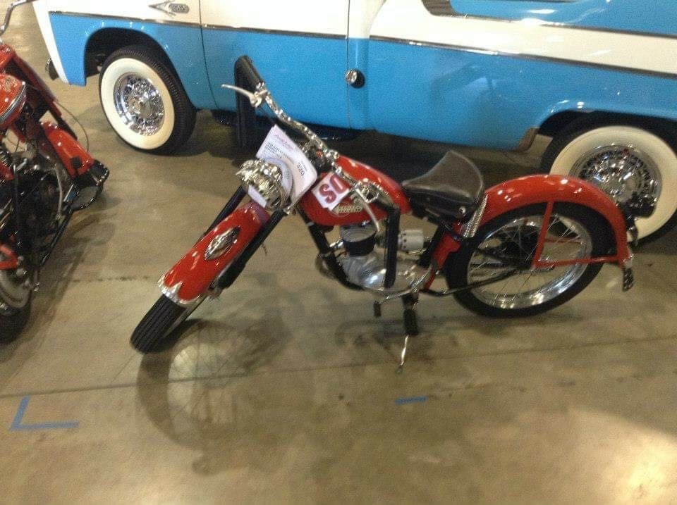 Here’s a ’59 Harley-Davidson Hummer that was at the 2013 Barrett-Jackson Auction in Palm Beach. The Harley-Davidson Hummer is a motorcycle that was made between 1955 and 1959. The engine is a 2 liter 1 cylinder engine that produces 3 horsepower. The transmission is a 3-speed foot shift. The top speed is 50 mph. This Harley-Davidson was auctioned off for $14,850.