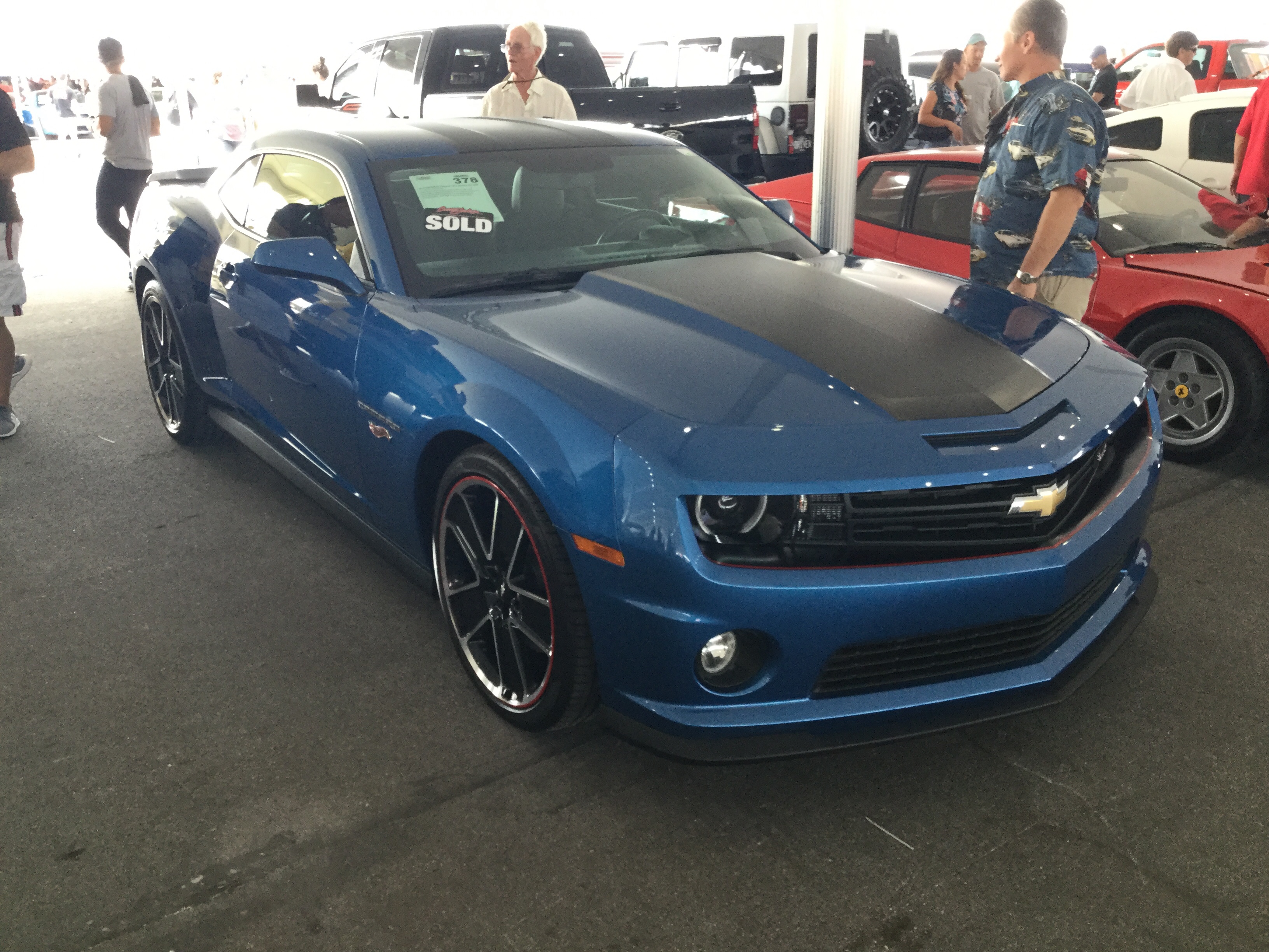 This is a 2013 Chevy Camaro Hot Wheels Edition that was at the 2021 Daytona Turkey Rod Run. The Chevy Camaro is a muscle car that was originally made between September of 1966 and August of 2002 (model years between 1967 and 2002). Production started back up in March of 2009 (the first model year was 2010). This is from the fifth generation, which was made between March of 2009 and November of 2015 (model years between 2010 and 2015). The engine is a 6.2 liter LS3 V8 that produces 426 horsepower and 420 pound-feet of torque. The transmission of this one is a 6-speed automatic.