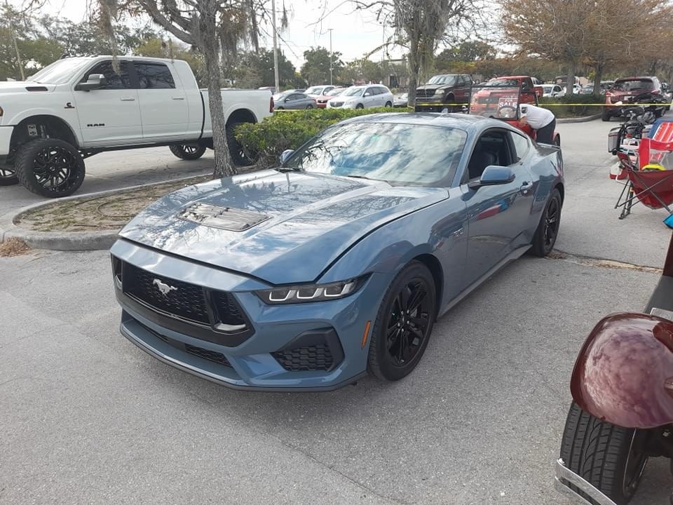 This is a 2019 Mustang RTR that was at the 2023 Gulf View Square Mall Car Show. The Mustang is a sports car that’s been in production since March of 1964. This is from the second phase of the sixth generation of the Mustang, which was made between 2017 and 2023 (model years between 2018 and 2023). The engine is a 5 liter supercharged Coyote V8 that produces 700 horsepower and 610 pound-feet of torque. The transmission is a 6-speed manual.