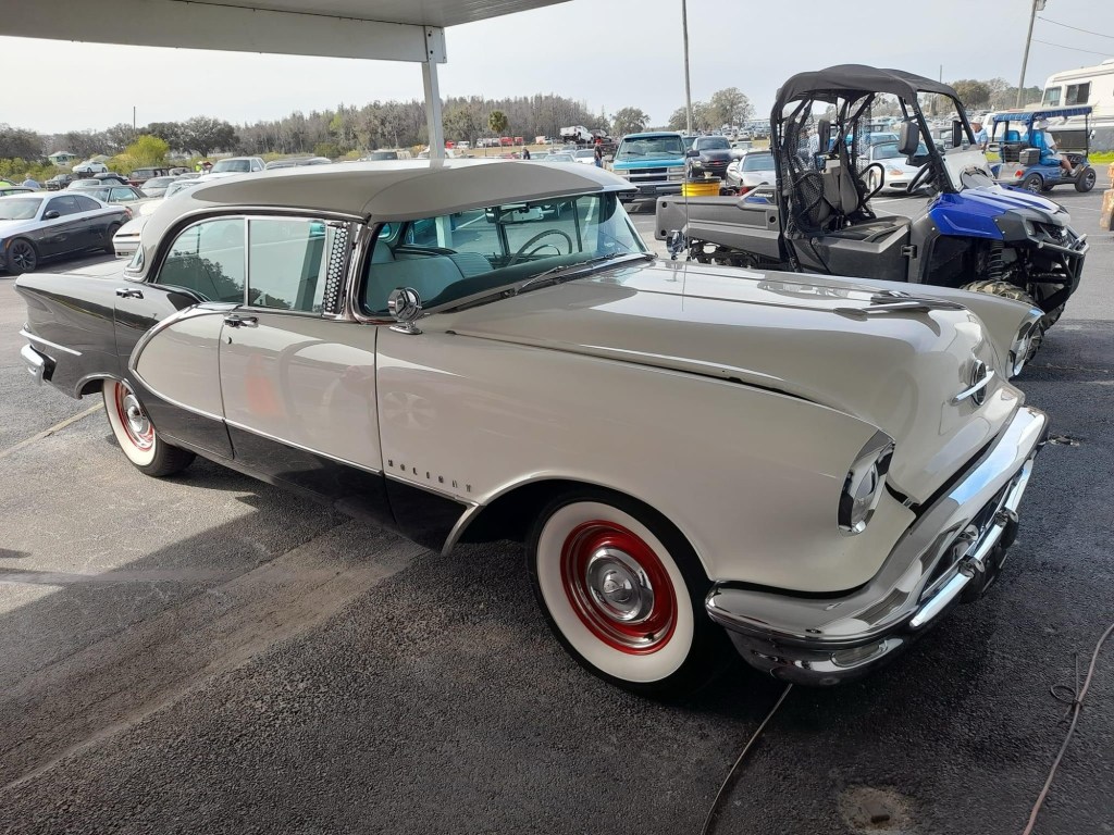 This is a ‘54 Oldsmobile 88 Holiday that was at the 2024 Zephyrhills Car Auction. The Oldsmobile 88 is a luxury car that was made between 1949 and 1999. This is from the second generation, which was made between 1954 and 1956. The engine is a 5.3 liter Rocket V8 that produces 185 horsepower and 300 pound-feet of torque. The transmission is a 3-speed manual. This car does 0-60 mph in 10.7 seconds and has a top speed of 105 mph.