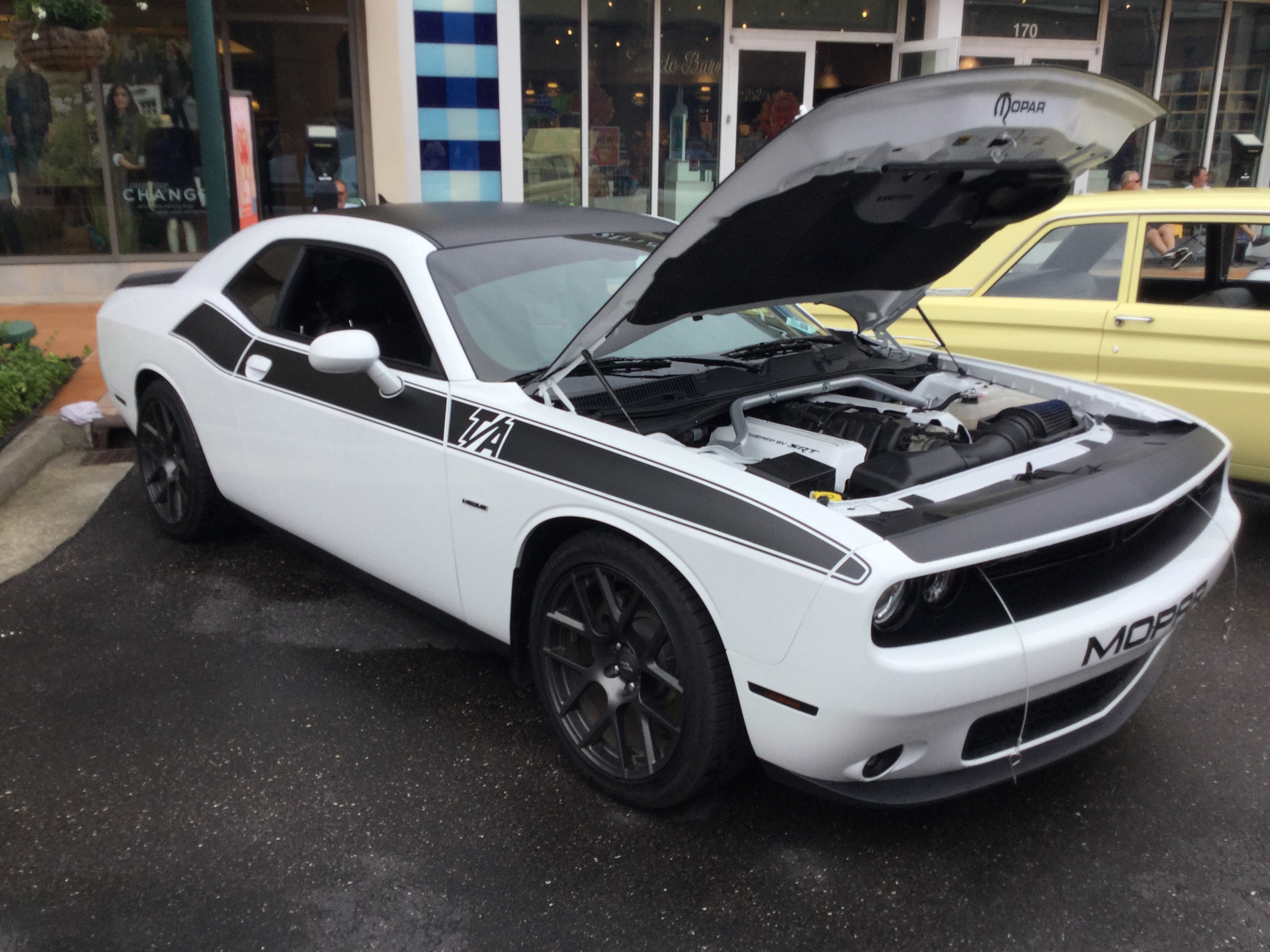 This is a 2019 Dodge Challenger T/A. The Dodge Challenger is a muscle car that was originally made between 1969 and 1974 (model years between 1970 and 1974). Production started back up in 2008. This is from the third generation, which has been in production since 2008. The engine is a 6.4 liter Hemi V8 that produces 485 horsepower and 475 pound-feet pf torque. The transmission of this one is an 8-speed automatic.